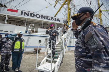 Sejumlah prajurit memberikan penghormatan kepada Komandan Pangkalan Utama TNI Angkatan Laut (Danlantamal) I Brigjen TNI (Mar) I Made Wahyu Santoso (tengah) usai meninjau KRI Bima Suci yang tiba di Pelabuhan Belawan, Medan, Sumatera Utara, Sabtu (24/10/2020). KRI Bima Suci-945 yang merupakan kapal layar latih bagi taruna/kadet aal itu bersandar selama tiga hari di Medan untuk melaksanakan sejumlah kegiatan dalam mendukung latihan praktek (Lattek) Kartika Jala Krida (KJK) 2020. ANTARA FOTO/Aditya Pradana Putra/hp.