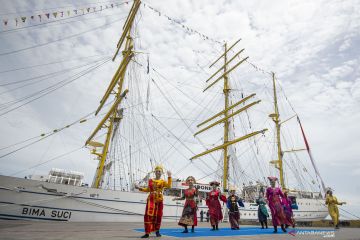 Sejumlah seniman menarikan tarian penyambutan KRI Bima Suci-945 yang membawa Taruna-taruna AAL tingkat III angkatan ke-67 saat tiba di Pelabuhan Belawan, Medan, Sumatera Utara, Sabtu (24/10/2020). KRI Bima Suci-945 yang merupakan kapal layar latih bagi taruna/kadet aal itu bersandar selama tiga hari di Medan untuk melaksanakan sejumlah kegiatan dalam mendukung latihan praktek (Lattek) Kartika Jala Krida (KJK) 2020. ANTARA FOTO/Aditya Pradana Putra/hp.