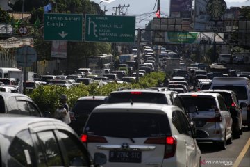 Sejumlah kendaraan memadati ruas jalan jalur Puncak, Gadog, Kabupaten Bogor, Jawa Barat, Rabu (28/10/2020). Pada cuti bersama serta libur panjang Maulid Nabi Muhammad SAW, jalur wisata Puncak Bogor mulai dipadati kendaraan wisatawan, Sat Lantas Polres Bogor memberlakukan rekayasa lalu lintas sistem satu jalur atau one way untuk mengurai kepadatan kendaraan. ANTARA FOTO/Yulius Satria Wijaya/hp.