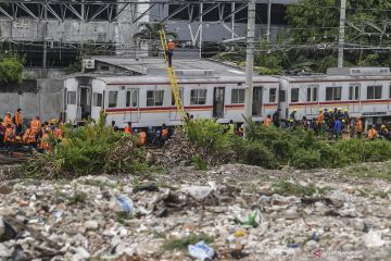 Sejumlah petugas mencoba mengevakuasi Kereta Rel Listrik (KRL) dengan nomor KA 1481 tujuan Bekasi-Jakarta Kota yang anjlok di kawasan Kampung Bandan, Jakarta, Jumat (30/10/2020). Akibat anjloknya KRL tersebut PT KAI membuat rekayasa pola rute KRL menuju Jatinegara, Bekasi-Jakarta Kota via Pasar Senen, dan dari Jatinegara menuju Bogor, sementara penyebab anjlok masih dalam penyelidikan pihak terkait. ANTARA FOTO/Muhammad Adimaja/foc.
