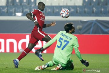 Pesepak bola Liverpool Sadio Mane (kiri) berhasil melewati penjagaan kiper Liverpool Marco Sportiello dan mencetak gol keempat untuk timnya dalam laga Group D Liga Champions, di Stadion Atleti Azzurri, Bergamo, Italia, Selasa (3/11/2020). Liverpool menang 5-0 atas Atalanta dan Diogo Jota mencetak hat-trick dalam pertandingan ini. ANTARA FOTO/Reuters-Alessandro Garofalo/hp.