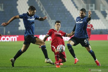 Pesepak bola Liverpool Roberto Firmino berupaya melewati penjagaan pesepak bola Atalanta Jose Palomino dalam laga Group D Liga Champions, di Stadion Atleti Azzurri, Bergamo, Italia, Selasa (3/11/2020). Liverpool menang 5-0 atas Atalanta dan Diogo Jota mencetak hat-trick dalam pertandingan ini. ANTARA FOTO/Reuters-Alessandro Garofalo/hp.