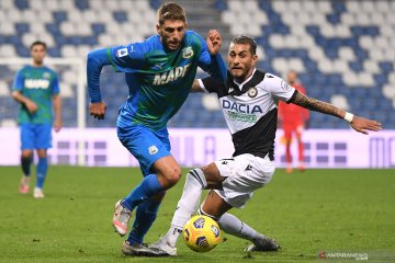 Pesepak bola Udinese Roberto Pereyra (kanan) berusaha mencegah laju serangan pesepak bola Sassuolo dalam laga pekan ketujuh Liga Italia, di Stadion Mapei - Citta del Tricolore, Reggio Emilia, Italia, Jumat (6/11/2020). Pertandingan ini berakhir imbang tanpa gol. ANTARA FOTO/Reuters-Alberto Lingria/hp.