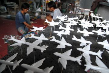Pekerja membuat miniatur pesawat dari bahan resin di Kampung Cangkrang, Desa Cikarawang, Dramaga, Kabupaten Bogor, Jawa Barat, Selasa (10/11/2020). Produksi miniatur pesawat di tempat tersebut mengalami penurunan sebesar 85 persen akibat terdampak pandemi COVID-19 dari sebelumnya 1000 menjadi 200 miniatur pesawat per bulan. ANTARA FOTO/Arif Firmansyah/foc.