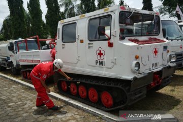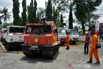 Petugas mempersiapakan kendaraan taktis hagglunds di Posko Palang Merah Indonesia (PMI) Pakem, Sleman, D.I Yogyakarta, Rabu (11/11/2020). Saat ini PMI dan Basarnas telah menyiagakan kendaraan taktis sebagai salah satu bentuk mitigasi bencana di lereng Gunung Merapi menyusul naiknya status Gunung Merapi dari waspada (level II) menjadi siaga (level III). ANTARA FOTO/Andreas Fitri Atmoko/foc.