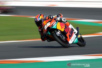 Pembalap Red Bull KTM Ajo Raul Fernandez memimpin saat balapan Moto3 Valencia Grand Prix di Sirkuit Ricardo Tormo, Valencia, Spanyol, Minggu (15/11/2020). ANTARA FOTO/REUTERS/Albert Gea/aww.