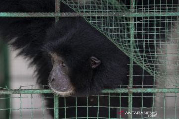 Seekor Siamang Sumatera (Symphalangus syndactylus) berada di kandang transit Balai Konservasi Sumber Daya Alam (BKSDA) Provinsi Sumatera Selatan Resort Punti Kayu Palembang, Sumatera Selatan, Senin (16/11/2020). BKSDA Provinsi Sumatera Selatan akan melepaskan liarkan enam ekor siamang Sumatera hasil serahan masyarakat ke habitat asalnya di Kabupaten Lahat, Sumatera Selatan. ANTARA FOTO/Nova Wahyudi/pras.