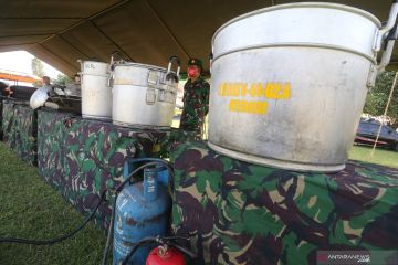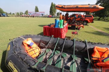 Petugas mengikuti apel kesiapsiagaan bencana hidrometeorologi di lapangan Desa Wonojoyol, Kediri, Jawa Timur, Sabtu (21/11/2020). Apel gabungan dari BPBD, TNI, Polisi, Satpol PP, Hansip, Tagana dan relawan tersebut sebagai upaya kesiapan menghadapi bencana yang dipengaruhi oleh faktor cuaca seperti banjir, tanah longsor, hingga puting beliung. ANTARA FOTO/Prasetia Fauzani/hp.
