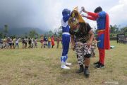 Sejumlah relawan menggunakan kostum super hero saat bermain bersama anak-anak di Tempat Pengungsian Sementara Gunung Merapi, Klakah, Selo, Boyolali, Jawa Tengah, Sabtu (21/11/2020). Selain untuk menghibur agar anak-anak tetap ceria di tempat pengungsian, kegiatan bermain dan mendongen tersebut juga memberikan nilai-nilai kebersamaan dan saling menolong dalam situasi apapun terutama menghadapi kebencaan Gunung Merapi. ANTARA FOTO/Aloysius Jarot Nugroho/hp.