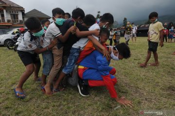 Seorang relawan menggunakan kostum super hero saat bermain bersama anak-anak di Tempat Pengungsian Sementara Gunung Merapi, Klakah, Selo, Boyolali, Jawa Tengah, Sabtu (21/11/2020). Selain untuk menghibur agar anak-anak tetap ceria di tempat pengungsian, kegiatan bermain dan mendongen tersebut juga memberikan nilai-nilai kebersamaan dan saling menolong dalam situasi apapun terutama menghadapi kebencaan Gunung Merapi. ANTARA FOTO/Aloysius Jarot Nugroho/hp.