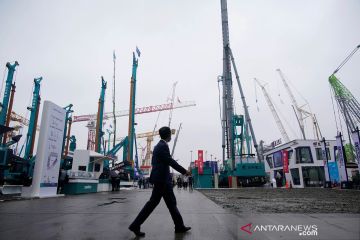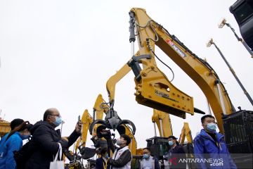 Pengunjung mengamati produk dalam pameran alat berat untuk konstruksi Bauma China di Shanghai, China, Rabu (25/11/2020). ANTARA FOTO/REUTERS/Aly Song/foc.