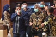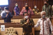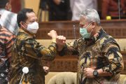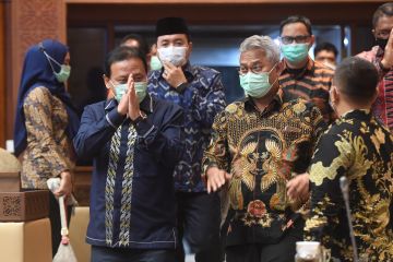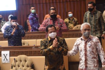Mendagri Tito Karnavian (tengah) memberikan salam sebelum mengikuti rapat kerja dengan Komisi II DPR di Kompleks Parlemen, Senayan, Jakarta, Kamis (26/11/2020). Rapat itu membahas data kependudukan dan data pemilih Pilkada Serentak 2020. ANTARA FOTO/Akbar Nugroho Gumay/wsj.