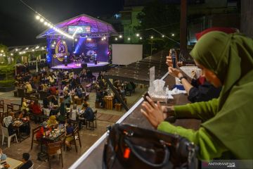 Sejumlah pengunjung menikmati suasana malam di salah satu kafe di Palu, Sulawesi Tengah, Sabtu (28/11/2020). Pemerintah setempat memberi kelonggaran waktu buka kafe pada malam-malam tertentu yang biasanya hanya hingga pukul 22.00 menjadi 24.00 namun harus tetap menerapkan protokol kesehatan pencegahan COVID-19. ANTARA FOTO/Basri Marzuki/foc.
