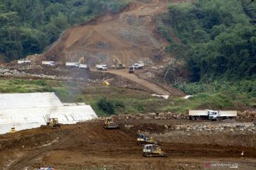 Suasana pembangunan Bendungan Ciawi dan Sukamahi di Cipayung, Megamendung, Kabupaten Bogor, Jawa Barat, Senin (30/11/2020). Data Kementerian PUPR menyebutkan pembangunan Bendungan Ciawi-Sukamahi di Kabupaten Bogor, Jawa Barat sudah mencapai 60 persen dan bendungan yang merupakan bagian dari rencana induk pengendalian banjir di Jakarta itu baru bisa digunakan pada akhir 2022 mendatang. ANTARA FOTO/Yulius Satria Wijaya/wsj.