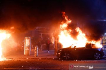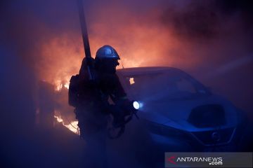 Mobil terbakar saat ricuh demo menolak RUU Keamanan di Paris, Prancis, Sabtu (5/12/2020). Para demonstan menilai RUU Keamanan bakal membatasi pengambilan gambar petugas polisi dan melanggar kebebasan jurnalis di negara tersebut. ANTARA FOTO/Reuters/Gonzalo Fuentes/pras.