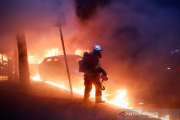 Petugas memadamkan api saat ricuh demo menolak RUU Keamanan di Paris, Prancis, Sabtu (5/12/2020). Para demonstan menilai RUU Keamanan bakal membatasi pengambilan gambar petugas polisi dan melanggar kebebasan jurnalis di negara tersebut. ANTARA FOTO/Reuters/Gonzalo Fuentes/pras.