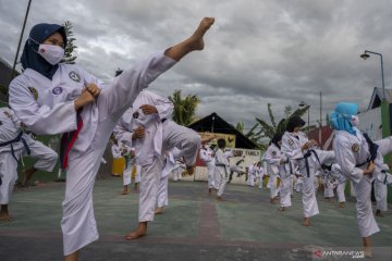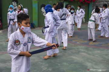 Sejumlah remaja mengikuti latihan di salah satu klub pembinaan olahraga Taekwondo di Palu, Sulawesi Tengah, Sabtu (12/12/2020). Setelah tidak beraktivtas akibat pandemi COVID-19, sejumlah klub pembinaan olahraga di wilayah itu kembali dibuka dan melaksanakan latihan dengan menerapkan protokol kesehatan. ANTARA FOTO/Basri Marzuki/hp.