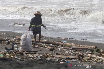 Warga memungut sampah plastik di Pantai Trisik, Kulon Progo, DI Yogyakarta, Minggu (13/12/2020). Memasuki musim penghujan, kondisi Pantai Trisik kotor akibat sampah kiriman dari Sungai Progo bermuara di kawasan tersebut. ANTARA FOTO/Prasetia Fauzani/rwa.