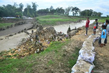 Warga melihat jembatan roboh di Desa Anggaswangi, Godong, Grobogan, Jawa Tengah, Jumat (18/12/2020). Jembatan sepanjang 15 meter tersebut roboh pada Kamis (17/12/2020) sore akibat diterjang derasnya arus sungai. ANTARA FOTO/Yusuf Nugroho/foc.