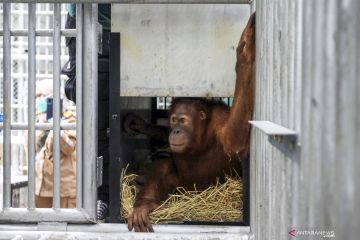 Satu individu Orangutan Sumatra (Pongo abelii) berada di dalam kandang karantina sementara saat tiba di Terminal Kargo Bandara Sultan Thaha Saifuddin, Jambi, Jumat (18/12/2020). Dua individu Orangutan Sumatra berjenis kelamin betina bernama Ung Aing dan Natalee yang merupakan hasil sitaan Polisi Penanggulangan Kejahatan Sumber Daya alam dan Lingkungan Thailand (NRCD) pada tanggal 21 Desember 2016 tersebut direpatriasi ke Indonesia setelah dirawat dalam pengawasan oleh Khao Prathubchang Wildlife Rescue Center (KPRC). ANTARA FOTO/Danendra/wsj.