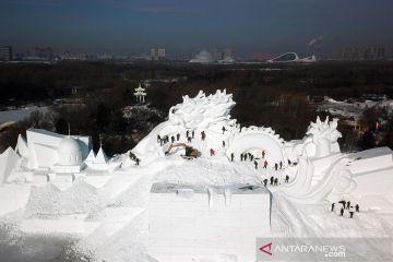 Foto udara para pemahat salju mengerjakan patung salju utama di kompleks Pameran Seni Pahatan Salju Internasional Pulau Matahari Harbin ke-33 di Harbin, Provinsi Heilongjiang, China timur laut, Jumat (18/12/2020). ANTARA FOTO/Xinhua/Wang Jianwei/pras.