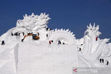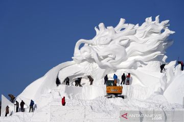 Para pemahat salju mengerjakan patung salju utama di kompleks Pameran Seni Pahatan Salju Internasional Pulau Matahari Harbin ke-33 di Harbin, Provinsi Heilongjiang, China timur laut, Jumat (18/12/2020). ANTARA FOTO/Xinhua/Wang Jianwei/pras.