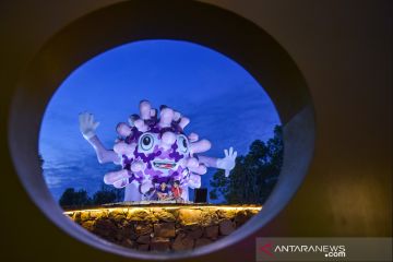 Sejumlah bocah duduk di bawah Tugu Virus Corona di objek wisata Asia Farm di Kota Pekanbaru, Riau, Sabtu (26/12/2020). Tugu Virus Corona dibuat oleh pengelola objek wisata sebagai pengingat bagi pengunjung untuk tetap bisa berwisata dengan menerapkan protokol kesehatan pada masa pandemi COVID-19. ANTARA FOTO/FB Anggoro/aww.