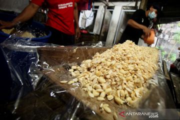 Perajin tempe mengangkat kedelai rebus di tempat produksi, Wonocolo, Surabaya, Jawa Timur, Minggu (3/1/2021). Naiknya harga kedelai dari harga Rp7.000 per kilogram menjadi Rp9.300 per kilogram memaksa sejumlah perajin tempe menyiasatinya dengan menaikkan harga jual tempe dari Rp5.000 menjadi Rp7.000 per potong atau memperkecil ukuran tempe dengan harga jual tetap Rp5.000 per potong. ANTARA FOTO/Didik Suhartono/rwa.