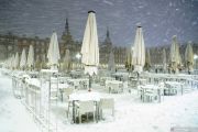 Sejumlah meja tertutup salju yang terlihat di alun-alun Plaza Mayor saat salju turun di Madrid, Spanyol, Jumat (8/1/2021). ANTARA FOTO/Reuters-Juan Medina/hp.