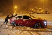 Sejumlah orang mendorong mobil yang kesulitan berjalan karena turunnya hujan salju yang lebat, di Madrid, Spanyol, Jumat (8/1/2021). ANTARA FOTO/Reuters-Susana Vera/hp.