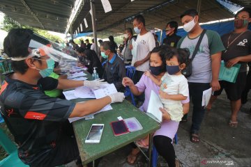 Petugas melayani warga penerima Bantuan Sosial Tunai (BST) di Lapangan Pacar Keling, Surabaya, Jawa Timur, Sabtu (9/1/2021). Kantor Pos Surabaya menyalurkan BST program Kementerian Sosial kepada 204.000 Keluarga Penerima Manfaat (KPM) senilai Rp.300 ribu untuk setiap penerima di Surabaya secara bertahap dan dijadwalkan selesai penyalurannya pada Selasa (9/1/2021). ANTARA FOTO/Didik Suhartono/hp.