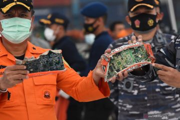 Direktur Operasi Basarnas Brigjen TNI (Mar) Rasman (kiri) menunjukkan kotak penyimpanan memori dari perekam suara kokpit atau Cockpit Voice Recorder (CVR) pesawat Sriwijaya Air PK-CLC nomor penerbangan SJ 182 rute Jakarta - Pontianak yang dibawa oleh KRI Kurau setibanya di posko pencarian di Dermaga JICT, Tanjung Priok, Jakarta Utara, Minggu (17/1/2021). Dalam proses pencarian di hari kesembilan, tim SAR gabungan sudah menemukan kotak CVR namun modul memori masih dalam proses pencarian untuk bisa diteliti lebih jauh penyebab jatuhnya pesawat. ANTARA FOTO/Indrianto Eko Suwarso/wsj.