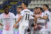 Pemain AC Milan Zlatan Ibrahimovic bersama rekannya merayakan gol ke gawang Cagliari pada pertandingan Liga Italia Serie A di stadion Sardegna Arena, Cagliari, Selasa (19/1/2021) dini hari. Dua gol Ibrahimovic antar AC Milan menang 2-0 dan kokoh di puncak klasemen sementara. ANTARA FOTO/REUTERS/Alberto Lingria/pras.