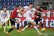 Pemain AC Milan Zlatan Ibrahimovic berebut bola dengan pemain Cagliari Luca Ceppitelli pada pertandingan Liga Italia Serie A di stadion Sardegna Arena, Cagliari, Selasa (19/1/2021) dini hari. Dua gol Ibrahimovic antar AC Milan menang 2-0 dan kokoh di puncak klasemen sementara. ANTARA FOTO/REUTERS/Alberto Lingria/pras.