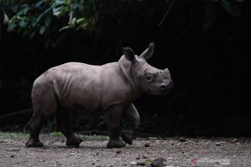 Anak Badak Putih (Ceratotherium simum) bernama Azsyifa berada di areal kandang Taman Safari Indonesia, Cisarua, Bogor, Jawa Barat, Jumat (22/1/2021). Anak badak putih hasil perkawinan induk bernama Chuma dan Merdeka tersebut menambah koleksi badak putih di Taman Safari Indonesia Bogor menjadi lima ekor. ANTARA FOTO/Wahyu Putro A/foc.