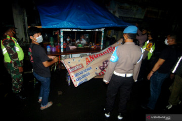 Personel TNI/Polri menutup paksa warung makanan saat razia Pelaksanaan Pembatasan Kegiatan Masyarakat (PPKM) di Tegal, Jawa Tengah, Sabtu (23/1/2021) malam. Razia PPKM gabungan TNI/Polri dan Satpol PP dengan membubarkan kerumuman masyarakat dan menutup paksa warung yang buka melewati pukul 21.00 WIB tersebut sebagai upaya pencegahan penyebaran COVID-19. ANTARA FOTO/Oky Lukmansyah/hp.