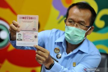 Kepala Kanwil Kementerian Hukum dan HAM Bali Jamaruli Manihuruk menunjukkan paspor warga negara Rusia Sergei Kosenko di Kantor Imigrasi Kelas I Khusus TPI Ngurah Rai, Badung, Bali, Minggu (24/1/2021). Sergei Kosenko yang viral di media sosial karena video aksinya terjun ke laut dengan mengendarai sepeda motor di Pelabuhan Tanah Ampo, Karangasem, Bali, dideportasi ke negaranya sesuai dengan Pasal 75 ayat 1 dan 2 Undang-Undang Nomor 6 tahun 2011 tentang Keimigrasian karena mengadakan pesta tanpa memperhatikan protokol kesehatan di masa pandemi COVID-19 serta diduga telah melakukan pelanggaran izin tinggal. ANTARA FOTO/Fikri Yusuf/hp.
