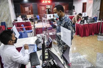 Pegawai Mahkamah Konstitusi (MK) menerima pendaftaran permohonan atas sengketa Pilkada 2020 di Gedung MK, Jakarta, Selasa (26/1/2021). Mahkamah Konstitusi mulai menyidangkan perselisihan Hasil Pilkada tahun 2020 dengan agenda pemeriksaan pendahuluan terhadap 35 perkara dari total 132 perkara yang terdaftar. ANTARA FOTO/M Risyal Hidayat/rwa.