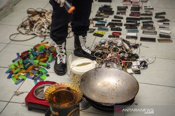 Petugas dari Kanwil Kemenkumham Sumsel menyusun barang bukti usai melakukan razia, di Lapas Klas 1 Merah Mata Palembang, Sumatera Selatan, Rabu (27/1/2021) malam. Razia tersebut di gelar terkait penangkapan salah seorang tersangka yang merupakan narapidana di lapas tersebut bernama Daeng Sabil, pemilik sekaligus pengendali barang bukti sabu seberat 171 kg, puluhan ribu butir ekstasi dan kapsul NPS (New Psychoactive Substances) oleh BNN pusat beberapa waktu yang lalu. ANTARA FOTO/Nova Wahyudi/aww.