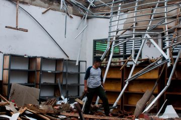 Seorang guru melihat kondisi di sekitar atap bangunan sekolah yang ambruk di SMAN 12 Pandeglang, Banten, Kamis (28/1/2021). Menurut pihak sekolah dua atap ruang biologi dan perpustakaan tersebut ambruk akibat angin kencang disertai hujan deras pada Rabu (27/1/) dan menyebabkan kerugian hingga seratusan juta rupiah. ANTARA FOTO/Muhammad Bagus Khoirunas/wsj.