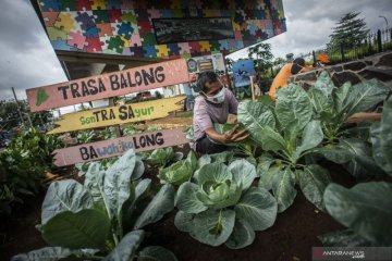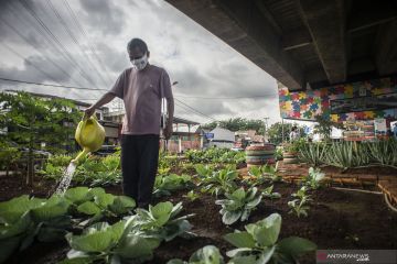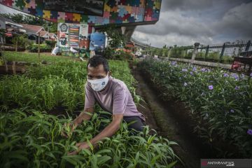 Warga merawat tanaman sayuran yang ditanam di Sentra Sayuran Bawah Kolong (Trasa Balong) Jalan Layang Cipinang, Jakarta, Selasa (2/1/2021). Trasa Balong merupakan salah satu inovasi kegiatan urban farming hasil swadaya masyarakat RW 08 Cipinang, Jakarta Timur yang memanfaatkan lahan kosong untuk ditanami berbagai jenis sayur mayur seperti kangkung, sawi, kol, cabai, selada dan tomat. ANTARA FOTO/Aprillio Akbar/wsj.