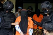 Tim gabungan Detasemen Khusus (Densus) 88 Antiteror Mabes Polri dan Brimob Polda Sulsel menggiring tersangka teroris saat akan diberangkatkan ke Jakarta di Bandara lama Sultan Hasanuddin, Kabupaten Maros, Sulawesi Selatan, Kamis (4/2/2021). Sebanyak 19 tersangka kasus terorisme jaringan Jamaah Ansharut Daulah (JAD) yang ditangkap Tim Densus 88 Antiteror di Makassar tersebut diterbangkan ke Jakarta untuk menjalani pemeriksaan lanjutan. ANTARA FOTO/Abriawan Abhe/hp.