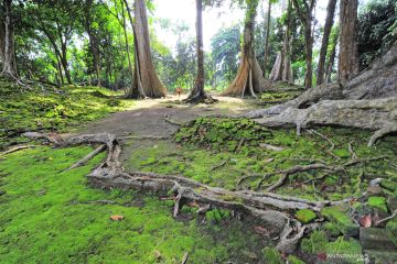 uru pelihara Candi Koto Mahligai menyapu bagian dalam situs di Kawasan Percandian Muarajambi, Muarojambi, Jambi, Sabtu (13/2/2021). Situs yang berada di sebelah barat gerbang masuk Kawasan Percandian Muarajambi tersebut dirawat oleh dua orang juru pelihara dari Balai Pelestarian Cagar Budaya (BPCB) Jambi. ANTARA FOTO/Wahdi Septiawan/hp.