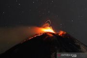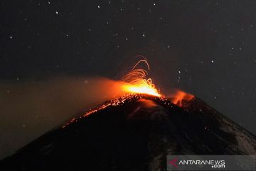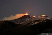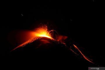 Aliran besar lava panas merah melesat ke langit malam saat Gunung Etna, gunung berapi paling aktif di Eropa, terlihat dari desa Fornazzo, di Catania, Italia, Senin (15/2/2021). Pejabat berwenang menyebut Gunung Etna adalah gunung berapi yang secara tradisional erupsinya berlangsung dalam waktu lama sehingga memerlukan pengawasan khusus. ANTARA FOTO/Reuters-Antonio Parrinello/hp.