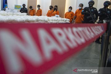 Petugas BNN menghadirkan sejumlah tersangka dan barang bukti dalam konferensi pers kasus peredaran narkotika di Kantor BNN, Jakarta, Rabu (17/2/2021). BNN bersama Bakamla berhasil mengungkap empat kasus peredaran narkotika jenis sabu di empat lokasi yakni Medan, Palembang, Jakarta dan Kepulauan Seribu dengan barang bukti sebanyak 466,19 kilogram sabu serta mengamankan 11 orang tersangka. ANTARA FOTO/Aditya Pradana Putra/rwa.
