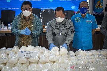 Petugas BNN menyusun barang bukti dalam konferensi pers kasus peredaran narkotika di Kantor BNN, Jakarta, Rabu (17/2/2021). BNN bersama Bakamla berhasil mengungkap empat kasus peredaran narkotika jenis sabu di empat lokasi yakni Medan, Palembang, Jakarta dan Kepulauan Seribu dengan barang bukti sebanyak 466,19 kilogram sabu serta mengamankan 11 orang tersangka. ANTARA FOTO/Aditya Pradana Putra/rwa.