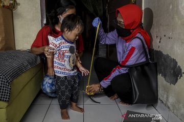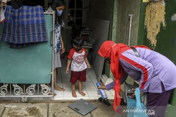 Kader Posyandu mengukur tinggi badan dari bocah saat melakukan pelayanan jemput bola di kawasan Green Garden, Rorotan, Jakarta Utara, Kamis (18/2/2021). Puskesmas Kelurahan Rorotan melakukan pelayanan jemput bola dikarenakan masih tingginya angka penularan COVID-19 di Ibu Kota. ANTARA FOTO/M Risyal Hidayat/pras.