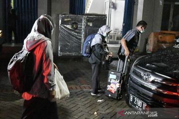 Sejumlah penyidik KPK bergegas usai melakukan penggeledahan kantor di Galaxy, Bekasi, Jawa Barat, Kamis (18/2/2021). KPK menggeledah kantor CV Bahtera Assa dan CV Abhinaya Putra Abadi terkait kasus dugaan korupsi bantuan sosial COVID-19. ANTARA FOTO/Fakhri Hermansyah/rwa.