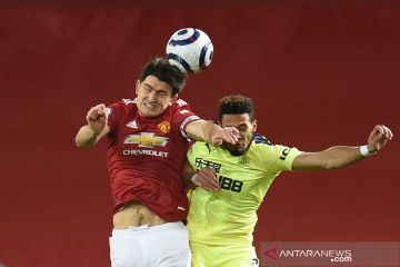 Pesepak bola Manchester United Harry Maguire (kiri) berebut bola dengan pesepak bola Newcastle United Joelinton (kanan) dalam laga lanjutan Liga Inggris, di Stadion Old Trafford, Manchester, Inggris, Minggu (21/2/2021). Manchester United berhasil mengalahkan Newcastle United 3-1. ANTARA FOTO/Pool via Reuters-Oli Scarff /hp