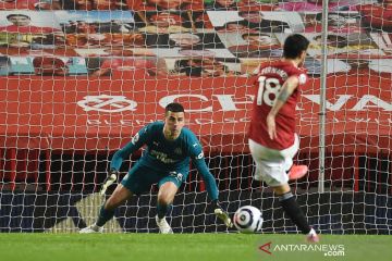 Pesepak bola Manchester United Bruno Fernandes mencetak gola dari titik penalti ke gawang Newcastle United dalam laga lanjutan Liga Inggris, di Stadion Old Trafford, Manchester, Inggris, Minggu (21/2/2021). Manchester United berhasil mengalahkan Newcastle United 3-1. ANTARA FOTO/Pool via Reuters-Oli Scarff /hp